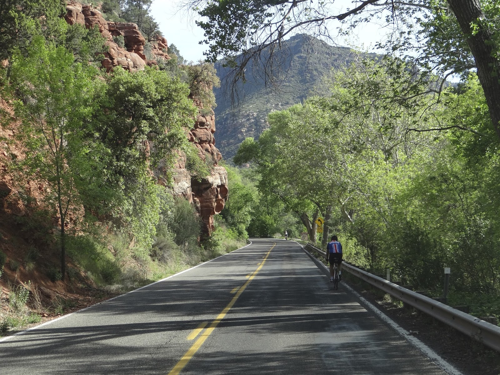 The early riders (us slow guys) were to start at 6:30. Mike (the trip leader) and I decided the best thing for me to do today is to be bumped up right from the start and miss the first 20 miles of climb. So, I rode up the road through beautiful red rock country, through the towns of Sedona and Old Town Sedona until we reached Oak Creek Canyon.